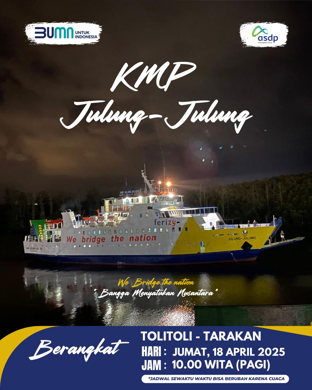 Tarakan (16/04/2025) – Kapal Ferry KMP Julung-Julung yang merupakan Kapal Pelayaran di bawah pengawasan ASDP Indonesia Ferry (Persero) Badan Usaha Milik Negara (BUMN). kini siap melayani perjalanan jalur laut masyarakat Kalimantan Utara (Kaltara) rute Tarakan – Toli-Toli. Kapal ini diharapkan dapat menjadi alternatif transportasi laut yang aman dan nyaman bagi masyarakat.