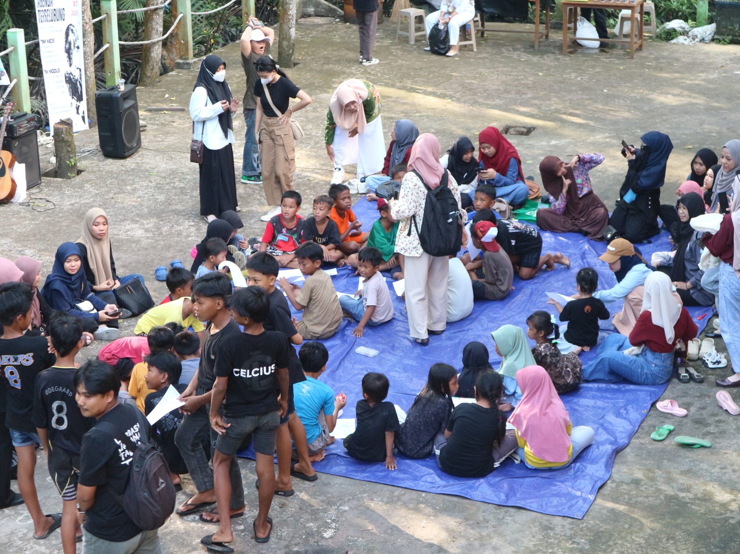 Suara sound system terdengung yang menyakitkan telinga itu akhirnya ada hasil dan terpakai. Terpal biru digelar, riasan ornamen terpasang sebagai altar panggung, anak-anak mengambar, para ibu-ibu sekitar antusias mengikuti cek kesehatan gratis. Ada yang menikmati musikalisasi puisi yang dibawakan oleh anak warga sekitar, ada yang sekedar berbincang dengan sesama teman, hingga ada pula yang menanyakan mengapa tempat acara berlangsung terlihat seperti anak-anak yang tidak diurus orang tuanya.