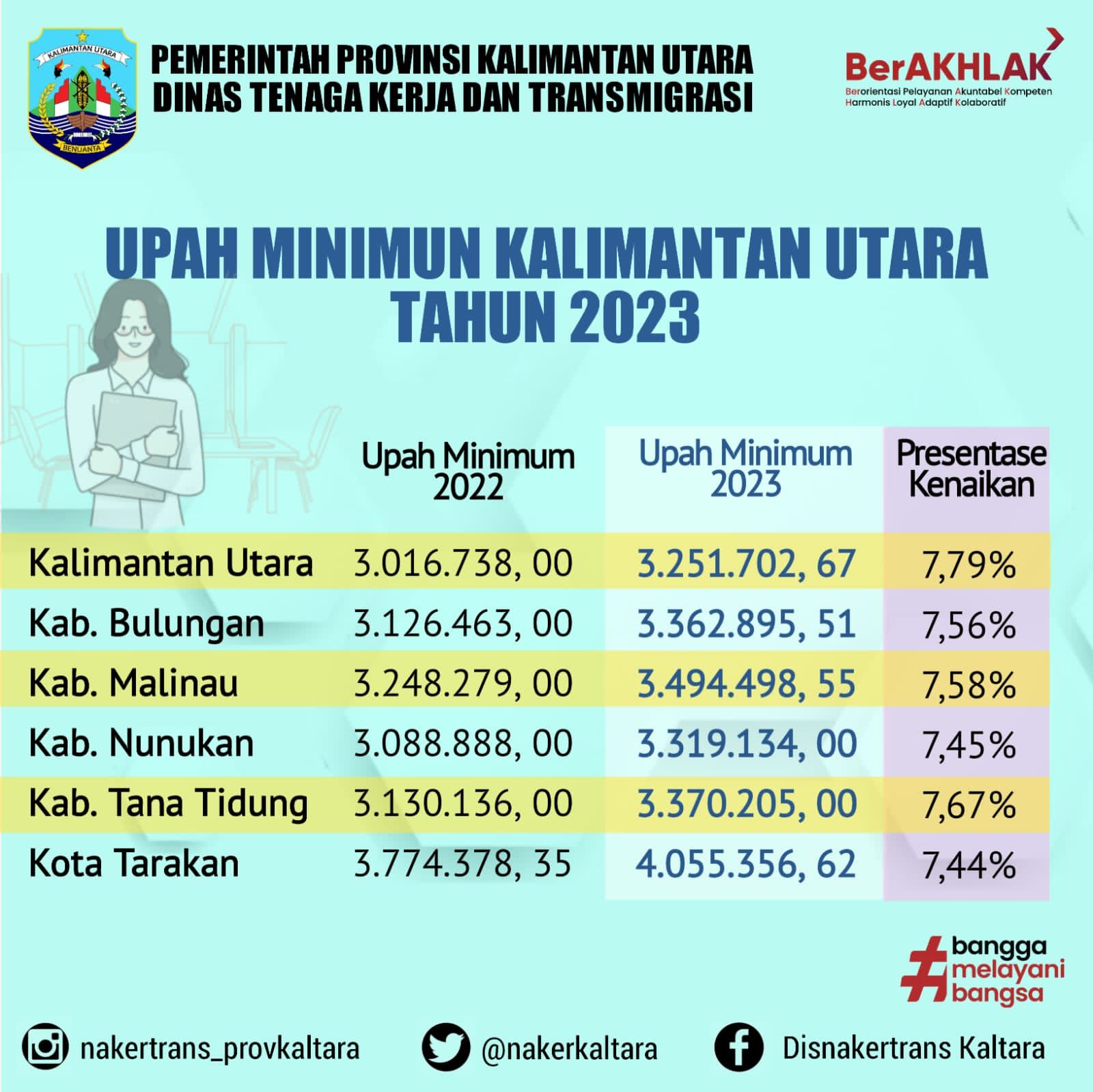 Sesui dengan SK Gubernur Kaltara No. 188.44/K.835/2022, tentang Upah Minimum Provinsi Kaltara Tahun 2023, UMP di Kaltara pada 2023 ditetapkan sebesar Rp 3.251.702,67