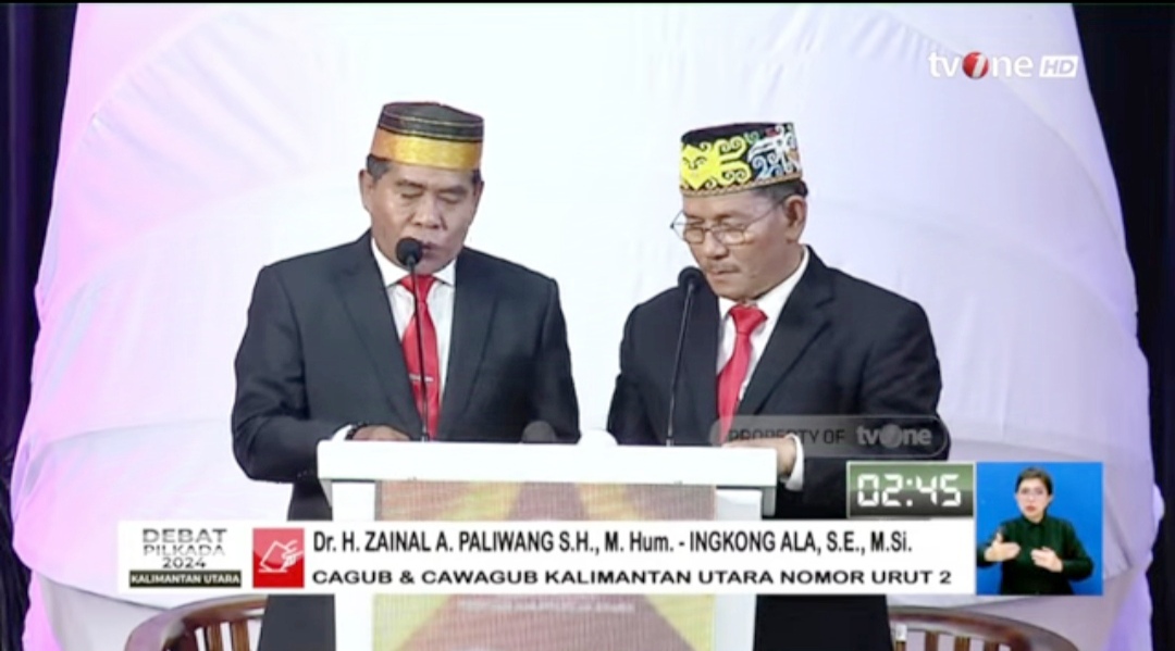 Borneonewsjournalist.co.id, BULUNGAN – Pasangan Calon Gubernur (Cagub) dan Calon Wakil Gubernur (Cawagub) Kalimantan Utara (Kaltara), Zainal Arifin Paliwang dan Ingkong Ala nomor urut 2 sampaikan closing statement dengan kilas balik capaian dan Keberhasilan pembangunan kaltara saat ini, dan rencana pembangunan masa depan Kaltara, pada debat ketiga Pemilihan Gubernur Kaltara yang diselenggarakan oleh Komisi Pemilihan Umum (KPU) Provinsi Kalimantan Utara pada Kamis, 7 November 2024 malam.