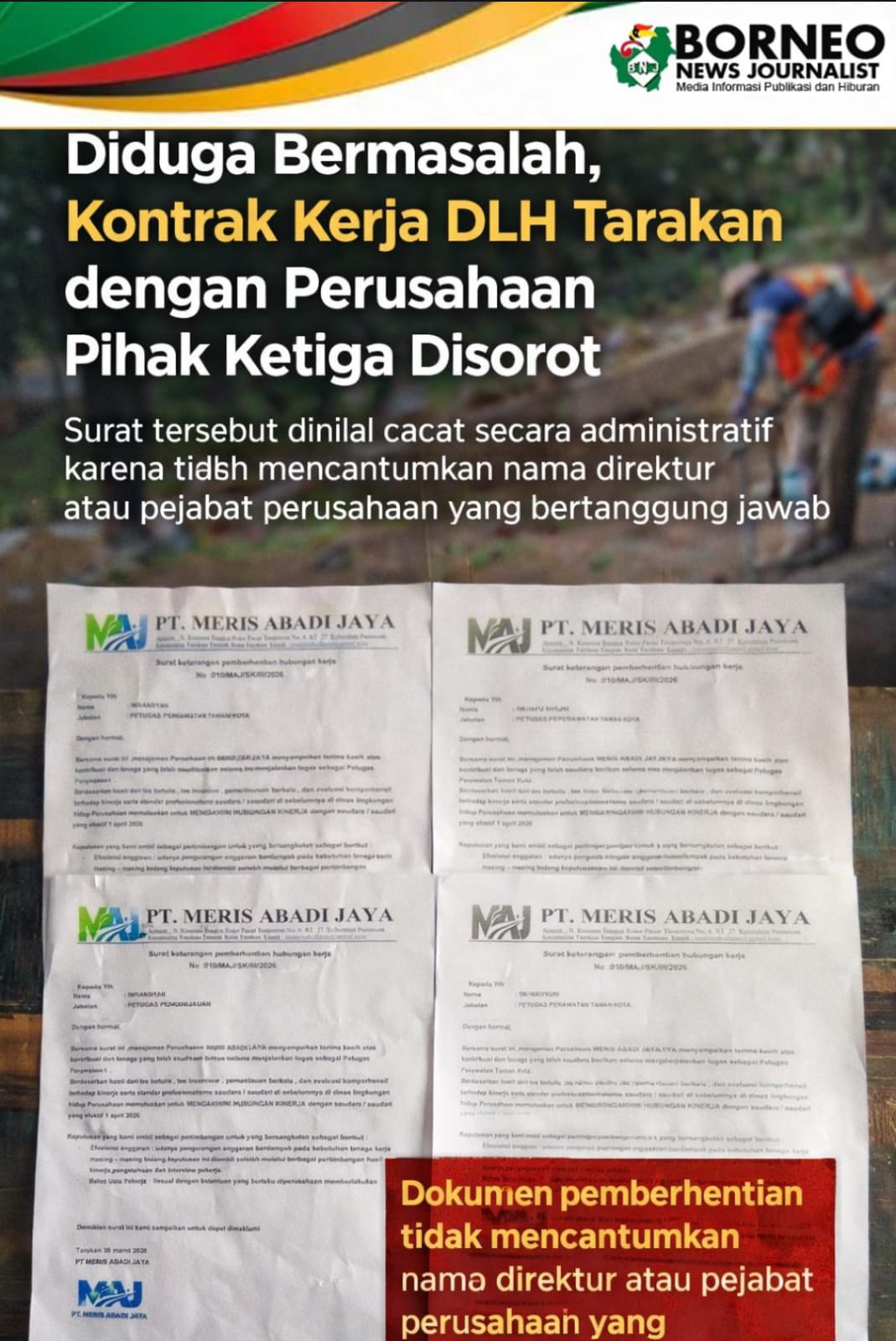 TARAKAN, KALTARA – Dugaan kejanggalan dalam kerja sama antara Dinas Lingkungan Hidup (DLH) Kota Tarakan dengan perusahaan pihak ketiga mencuat ke publik. PT Meris Abadi Jaya, yang saat ini menaungi para pekerja kebersihan di lingkungan DLH Tarakan, diduga merupakan perusahaan yang tidak memiliki kejelasan legalitas.