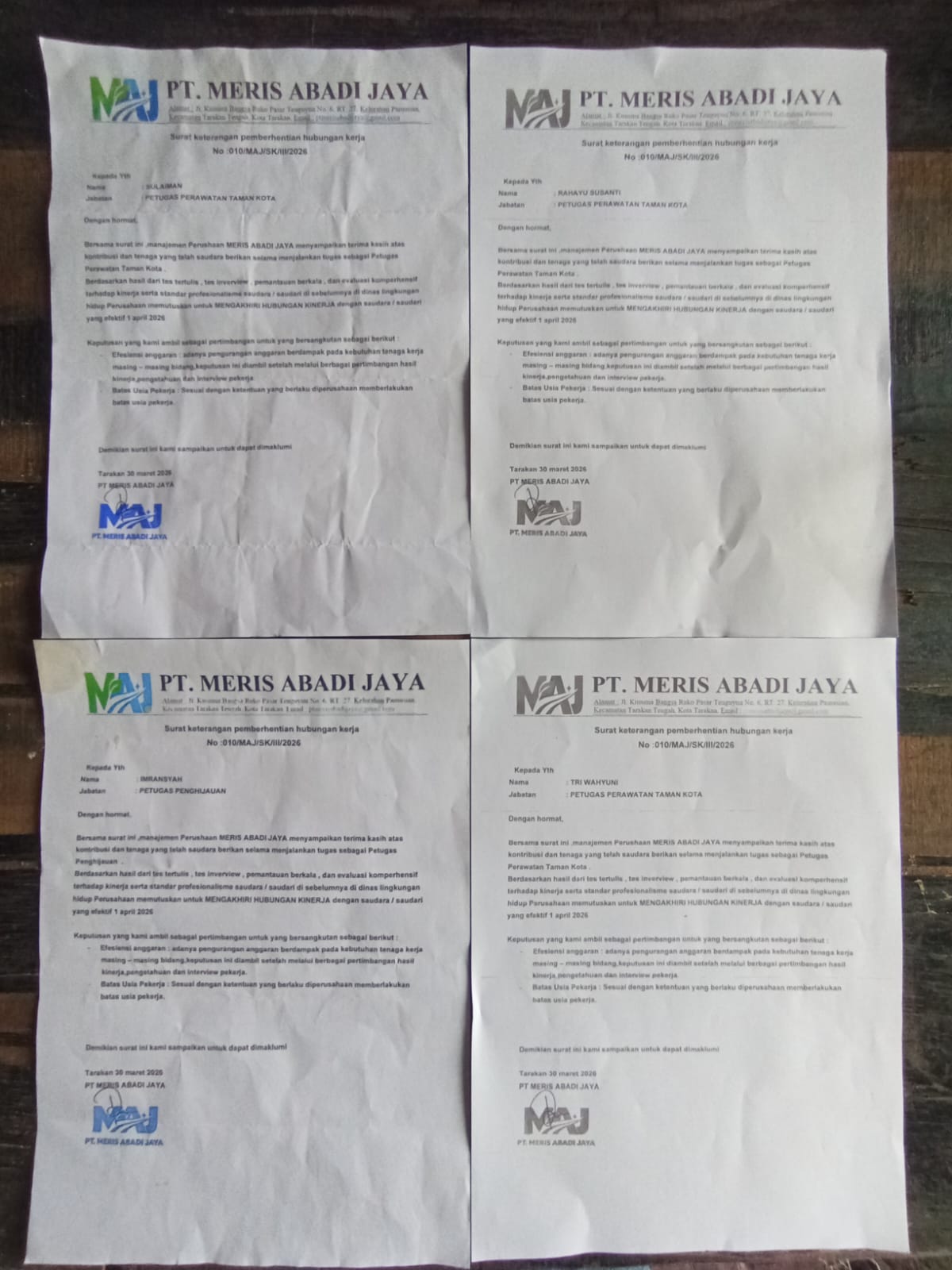 Keempat pekerja tersebut yakni Imransyah, Sulaiman, Triwahyuni, dan Rahayu Susanti. Mereka dinyatakan berhenti bekerja terhitung sejak 1 April 2026, berdasarkan surat pemberhentian yang diterbitkan oleh perusahaan pihak ketiga, PT Meris Abadi Jaya.