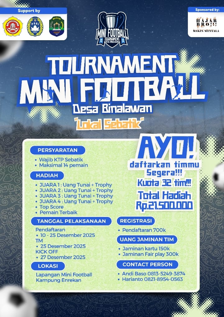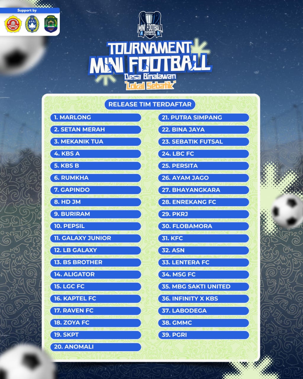 Sebatik, KALTARA – Desa Binalawan, Kecamatan Sebatik, Kabupaten Nunukan telah menutup tahap pendaftaran Turnamen Mini Football Lokal Sebatik. Sebanyak 39 tim dari berbagai desa dan komunitas sepak bola di Pulau Sebatik resmi terdaftar dan akan ambil bagian dalam turnamen tersebut.