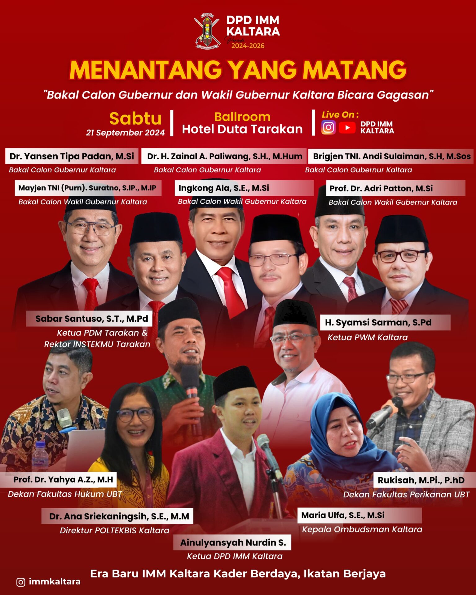 TARAKAN – Dewan Pimpinan Daerah (DPD) Ikatan Mahasiswa Muhammadiyah (IMM) Kalimantan Utara akan mengadakan uji publik kepada tiga kandidat pasangan calon Gubernur dan Wakil Gubernur Kalimantan Utara pada Sabtu, 21 September 2024. Acara ini bertempat di Hotel Duta Tarakan dengan tema “MENANTANG YANG MATANG: Bakal Calon Gubernur dan Wakil Gubernur Kalimantan Utara Bicara Gagasan”.