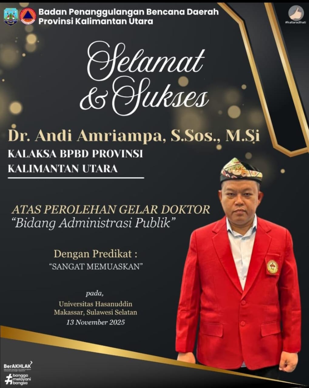 MAKASSAR – Kepala Pelaksana Badan Penanggulangan Bencana Daerah (BPBD) Provinsi Kalimantan Utara, Dr. Andi Amriampa, S.Sos., M.Si, resmi meraih gelar Doktor dalam Bidang Administrasi Publik dari Universitas Hasanuddin (Unhas) Makassar, Sulawesi Selatan. Gelar tersebut dikukuhkan pada Kamis, 13 November 2025, dengan predikat Sangat Memuaskan.