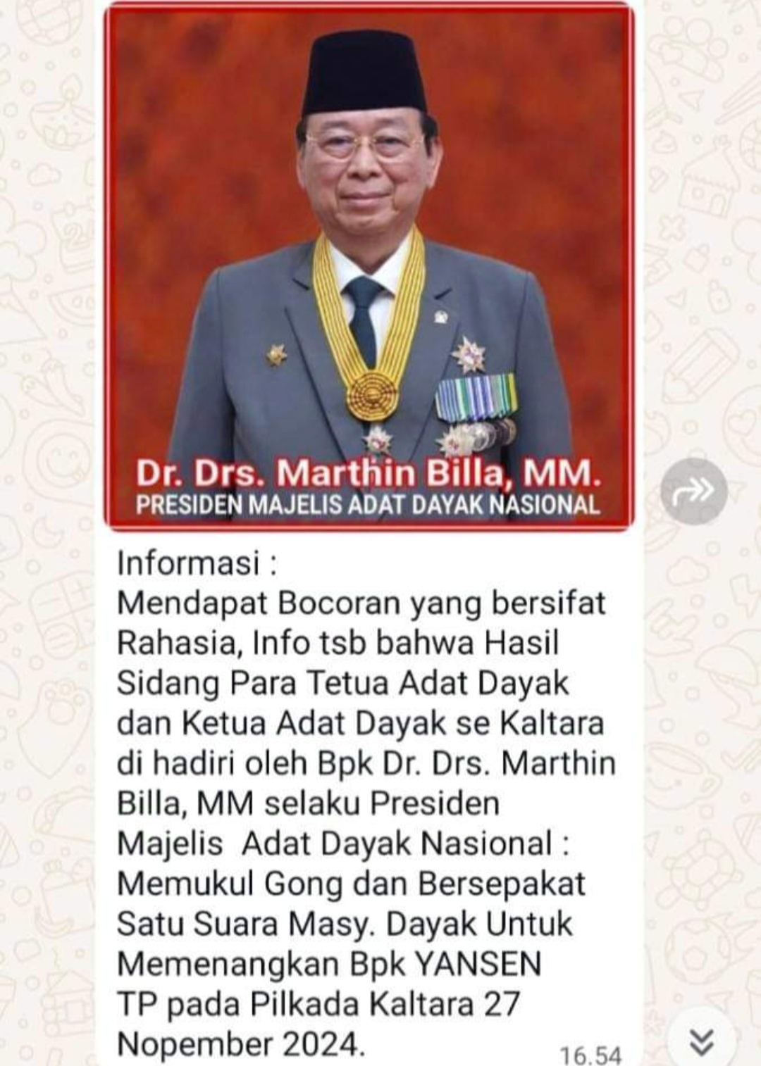 Saya Dr. Drs. Marthin Billa, MM. Presiden Majelis Adat Dayak Nasional mengkarifikasi bahwa saya tidak pernah menyatakan dukungan atas kesepakatan satu suara masyarakat Dayak untuk memenangkan Yansen TP pada pilkada Kaltara 27 November 2024.