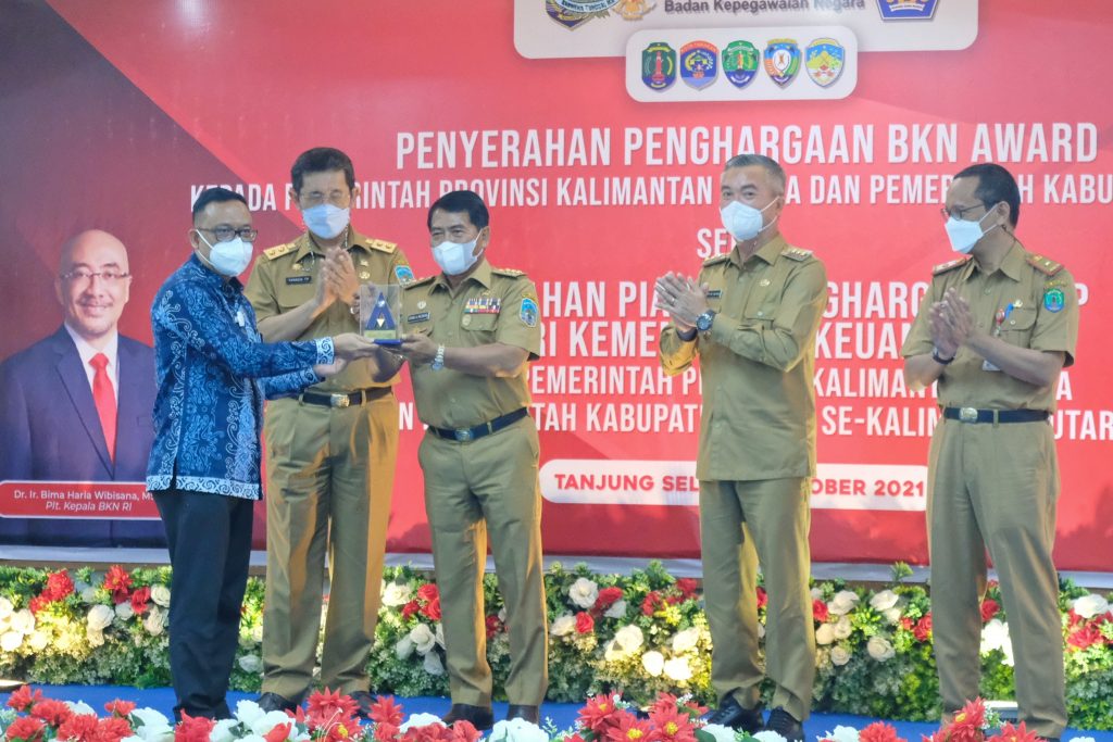 Penghargaan BKN Award diberikan oleh Pelaksana Tugas (Plt) Kepala BKN Republik Indonesia (RI), Bima Haria Wibisana kepada Gubernur Kaltara Drs. H. Zainal Arifin Paliwang SH. M.Hum dan Wakil Gubernur (Wagub) Kaltara Dr. Yansen TP. M.Si.