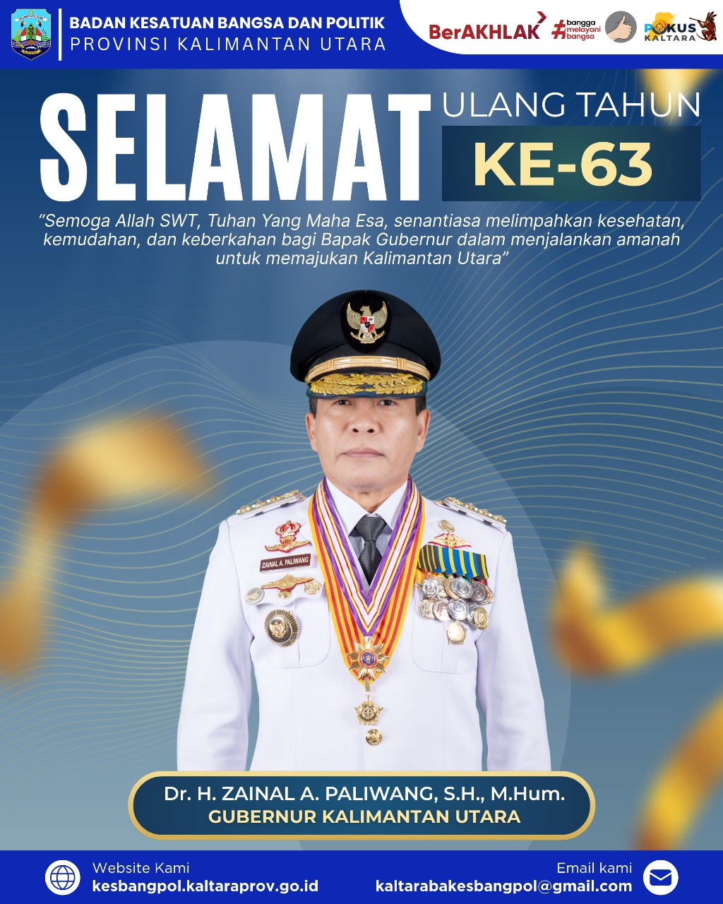 Tanjung Selor, KALTARA – Badan Kesatuan Bangsa dan Politik (Kesbangpol) Provinsi Kalimantan Utara menyampaikan ucapan selamat ulang tahun ke-63 kepada Gubernur Kalimantan Utara, Dr. H. Zainal A. Paliwang, S.H., M.Hum. Ucapan tersebut disampaikan sebagai bentuk apresiasi dan doa bagi kepemimpinan Gubernur dalam memajukan pembangunan di Bumi Benuanta.