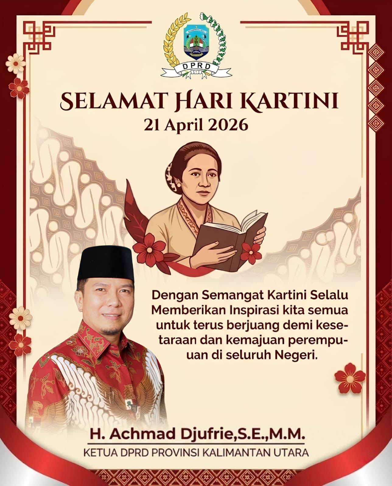 Di akhir pernyataannya, Achmad Djufrie menyampaikan ucapan selamat Hari Kartini kepada seluruh perempuan Indonesia, khususnya di Kalimantan Utara, seraya berharap semangat perjuangan terus tumbuh dan menjadi inspirasi lintas generasi.