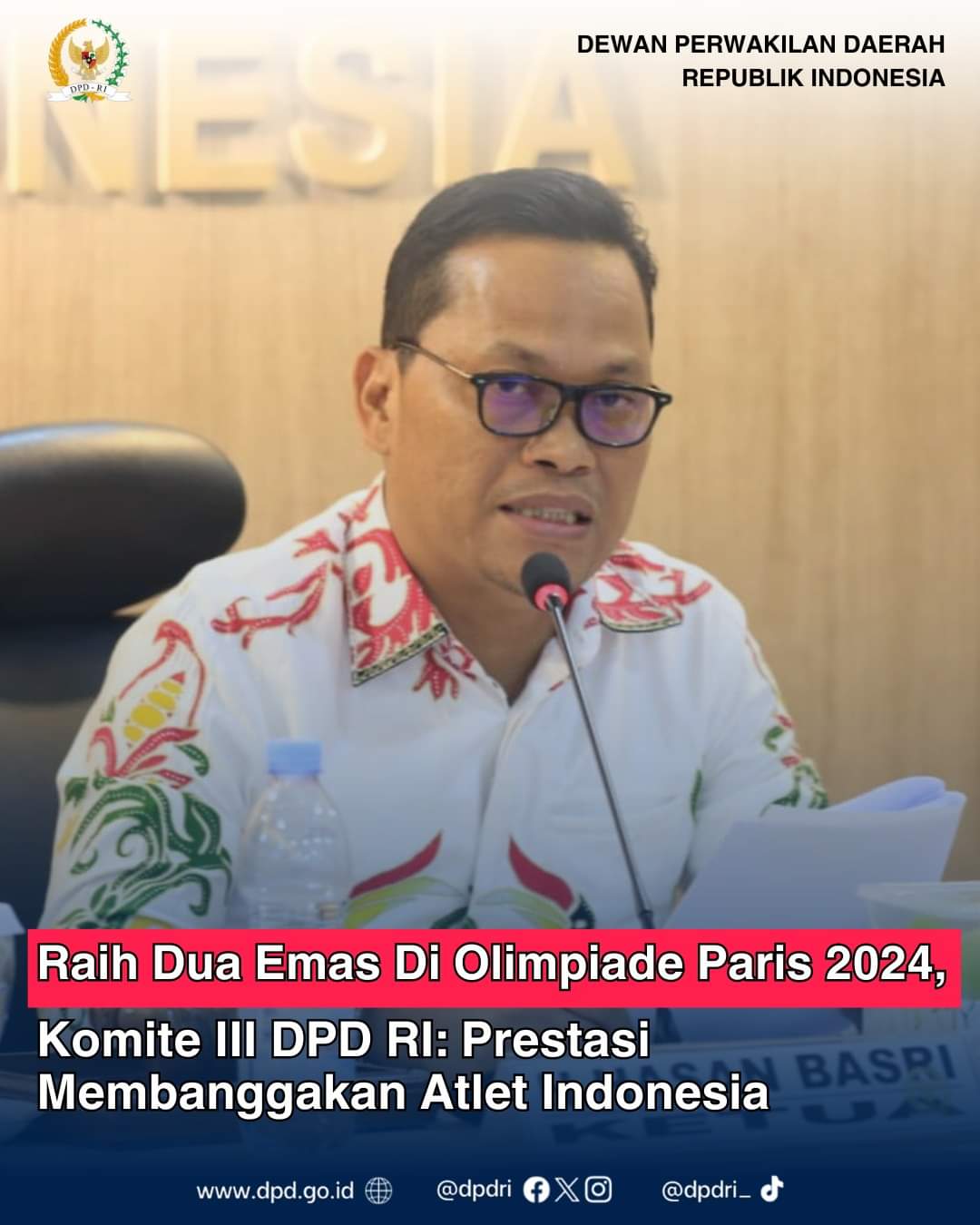 JAKARTA – Komite III DPD RI menyampaikan apresiasi tinggi atas perolehan dua medali emas yang diraih atlet Indonesia dalam ajang Olimpiade Paris 2024. Raihan dua medali emas masing-masing dari cabang olahraga Panjat Tebing nomor speed putra yang diperoleh atlet dari Kalimantan Barat Veddriq Leonardo dan dari cabang olahraga Angkat Besi kelas 73 kg yang diperoleh atlet asal Banten Rizki Juniansyah.