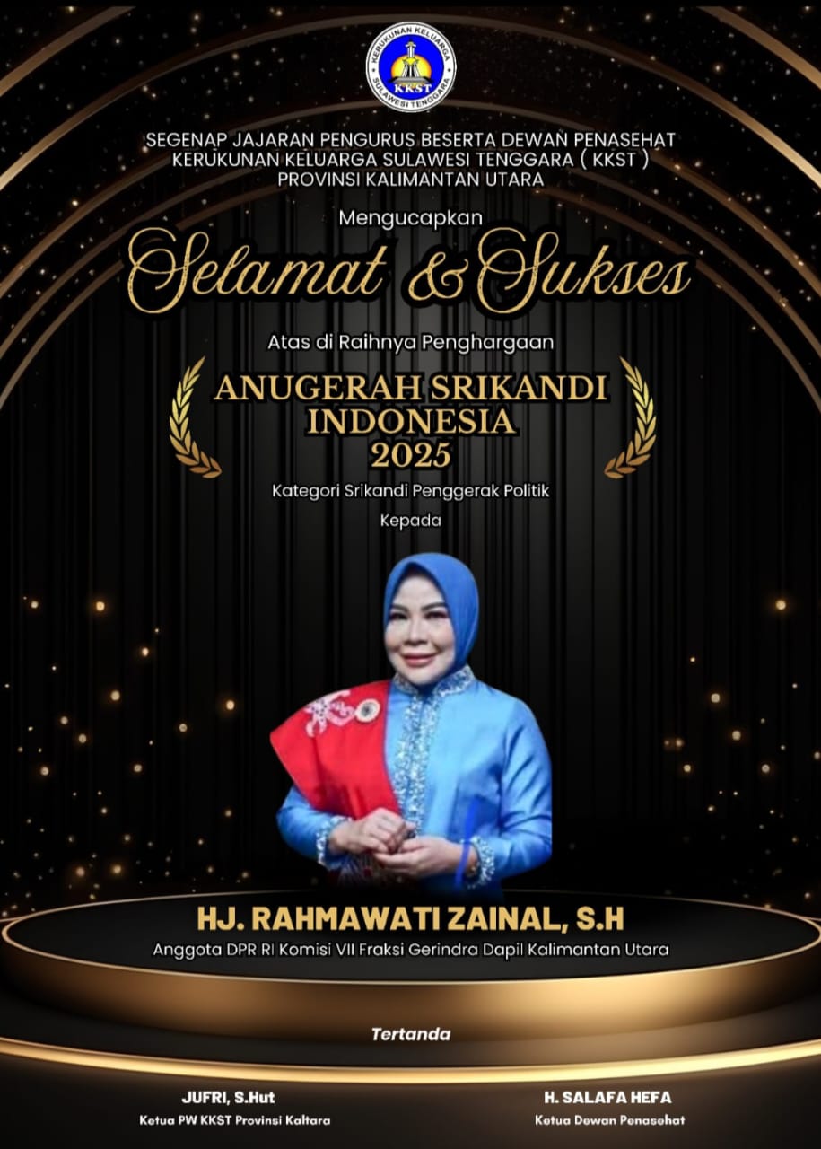 TANJUNG SELOR, KALTARA – Segenap jajaran pengurus dan Dewan Penasehat Kerukunan Keluarga Sulawesi Tenggara (KKST) Provinsi Kalimantan Utara menyampaikan ucapan selamat dan sukses kepada Hj. Rahmawati Zainal, S.H., Anggota DPR RI Komisi VII Fraksi Partai Gerindra dari Daerah Pemilihan Kalimantan Utara, atas diraihnya Anugerah Srikandi Indonesia 2025.