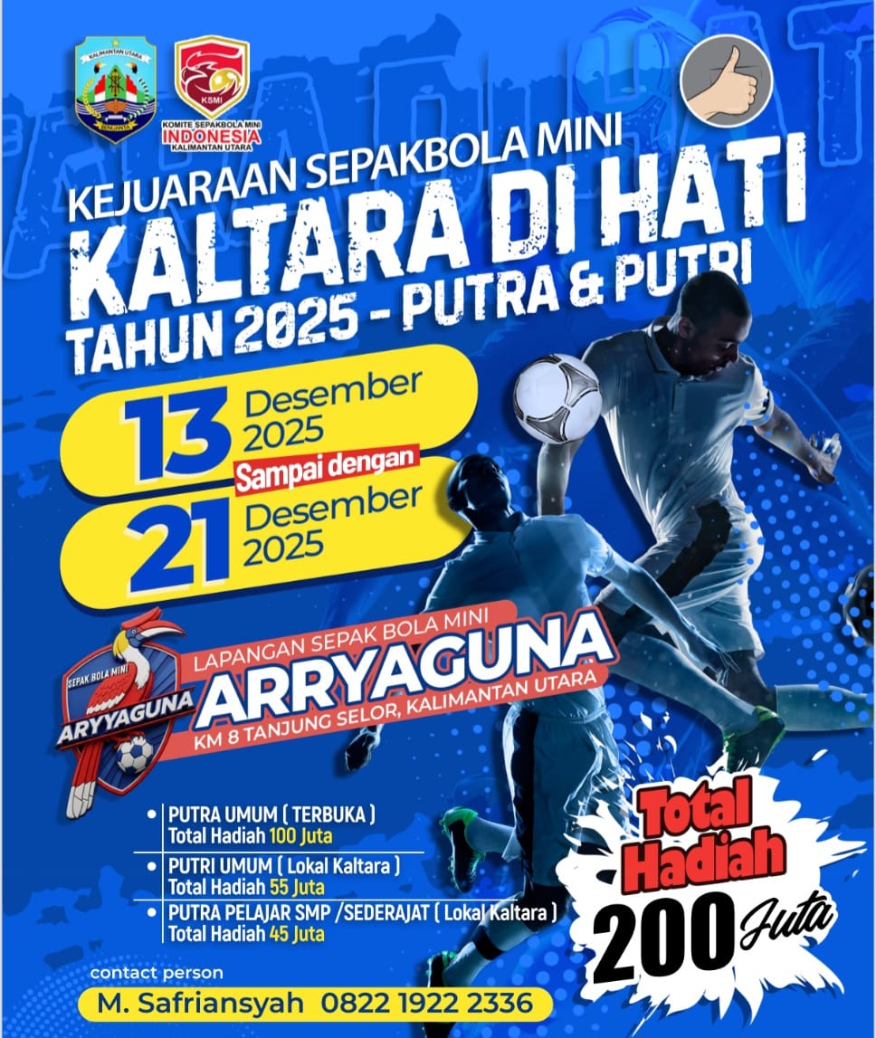 TANJUNG SELOR, KALTARA – Komite Sepakbola Mini Indonesia (KSMI) Kalimantan Utara resmi menggelar Kejuaraan Sepakbola Mini Kaltara 2025 yang akan berlangsung pada 13–21 Desember 2025 di Lapangan Sepakbola Mini Arriyaguna, KM 8 Tanjung Selor.