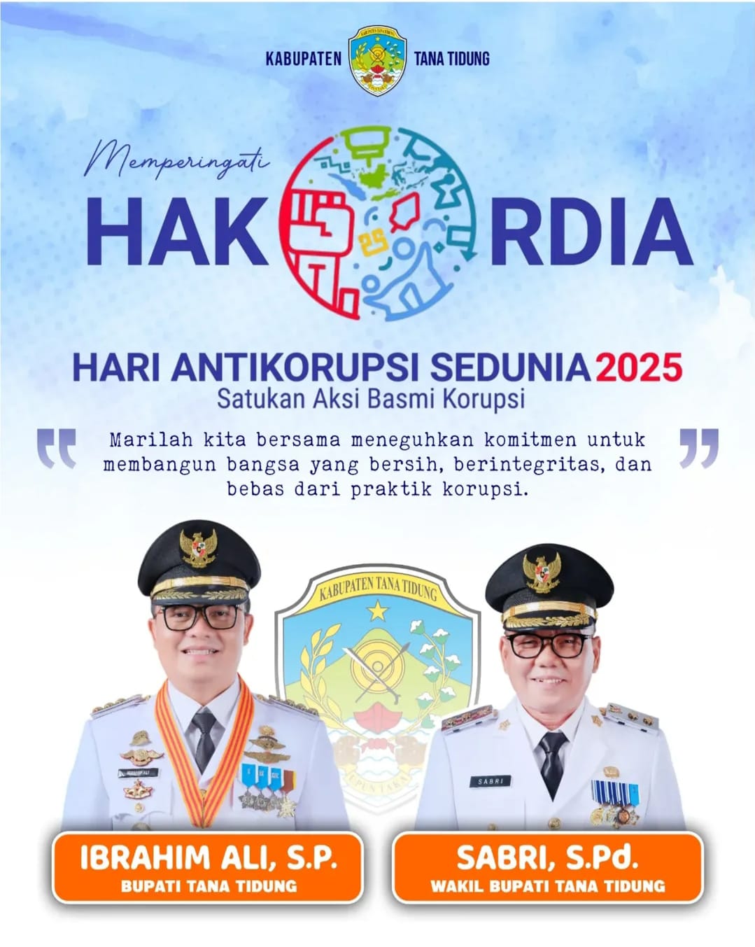 Bupati Tana Tidung, Ibrahim Ali, S.P., dan Wakil Bupati Sabri, S.Pd., menyampaikan bahwa peringatan Hakordia harus menjadi dorongan untuk memperkuat budaya antikorupsi mulai dari lingkungan pemerintahan hingga masyarakat luas.
