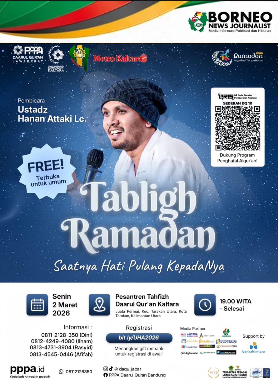 TARAKAN, KALTARA – Pendakwah nasional, Hanan Attaki, dijadwalkan mengisi rangkaian kajian Ramadan di Kota Tarakan, Kalimantan Utara, pada Senin (2/3/2026). Ustaz yang dikenal dengan gaya dakwah santai dan dekat dengan generasi muda ini akan hadir di dua lokasi berbeda.
