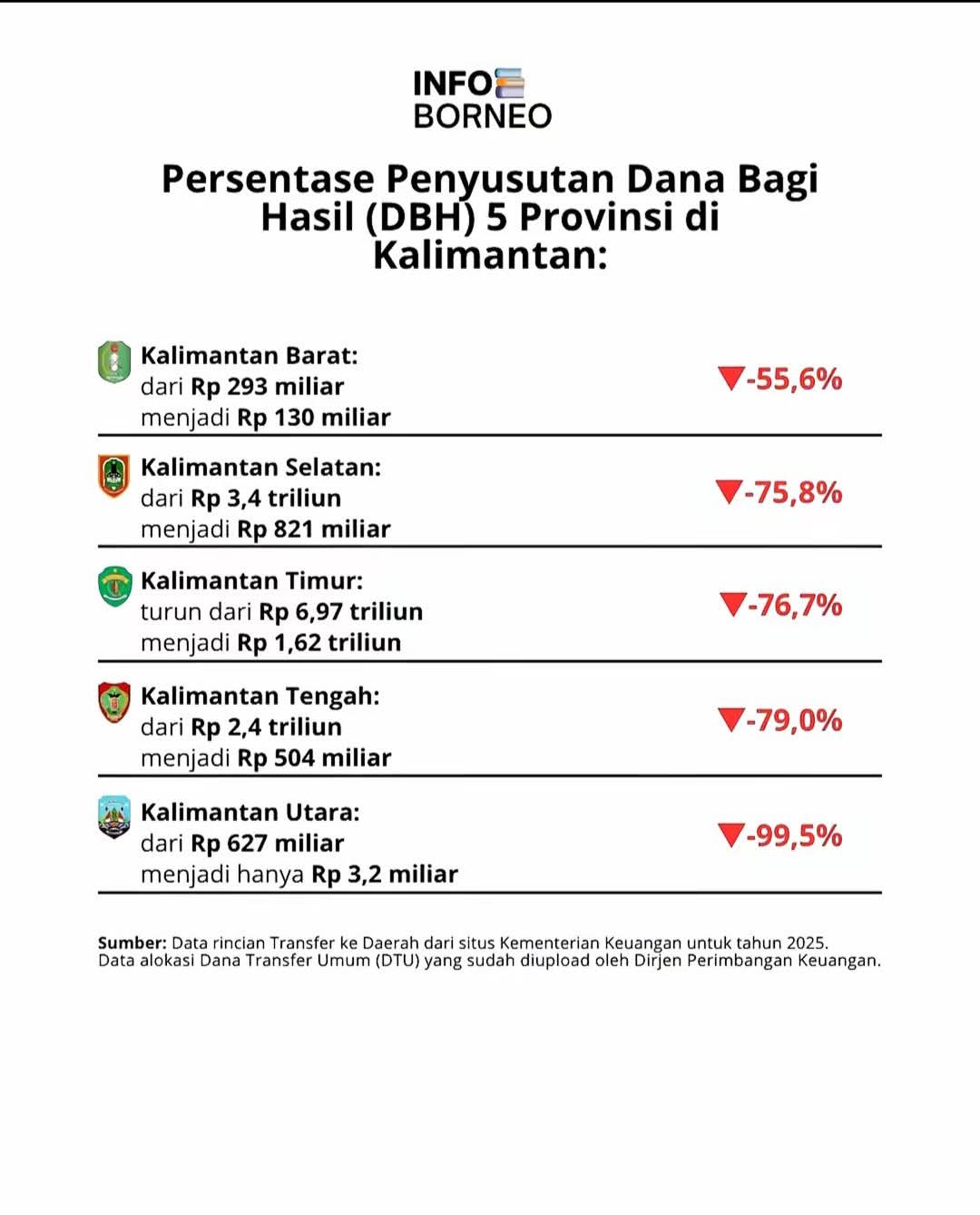 Dikutip dari kanal media sosial Info Borneo, berdasarkan data Kementerian Keuangan RI melalui rincian Transfer ke Daerah tahun 2025, terjadi penyusutan tajam pada nilai DBH untuk seluruh provinsi di Kalimantan.