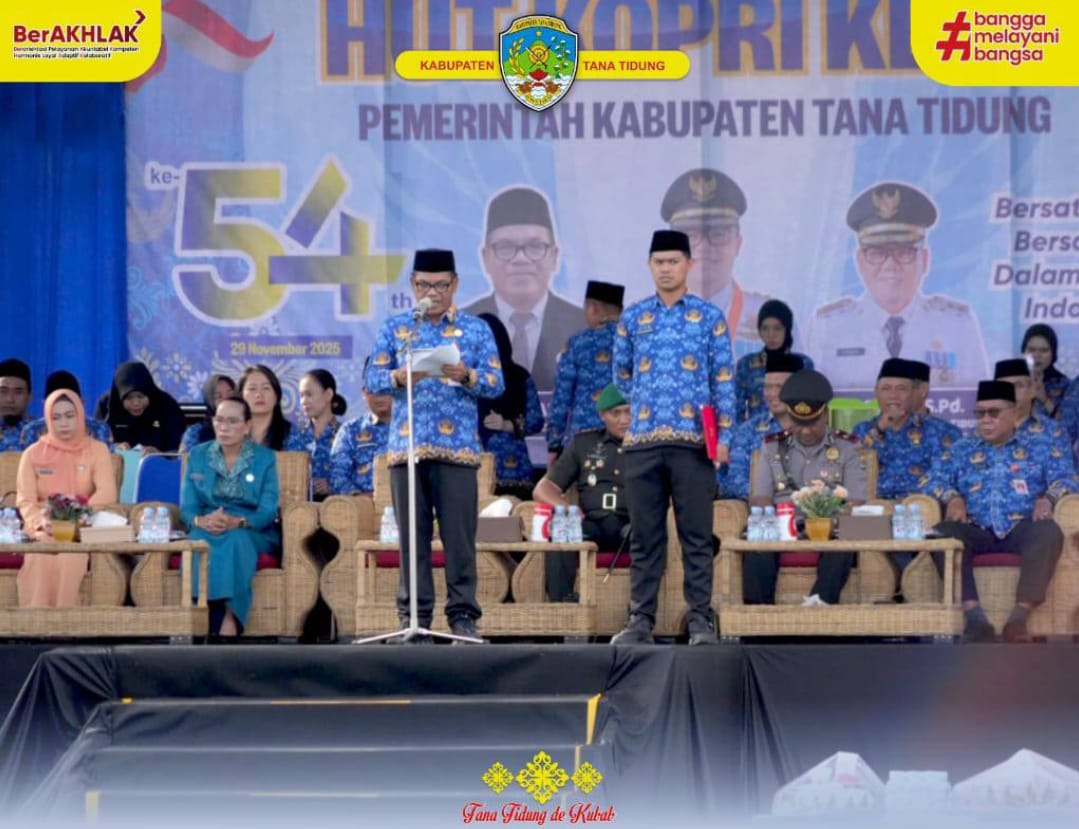 Tana Tidung, KALTARA – Pemerintah Kabupaten Tana Tidung menggelar upacara Peringatan Hari Ulang Tahun ke-54 Korps Pegawai Republik Indonesia (KORPRI) Tahun 2025 dengan tema “Bersatu, Berdaulat bersama KORPRI, Mewujudkan Indonesia Maju”. Kegiatan berlangsung di Ruang Terbuka Hijau (RTH) H. Joesoef Abdullah dan dihadiri oleh Sekretaris Daerah Kabupaten Tana Tidung, Dandim 0914/TNT, Kapolres Tana Tidung, Wakil Ketua TP PKK, Ketua Dharma Wanita Persatuan, para kepala OPD, serta seluruh ASN se-Kabupaten Tana Tidung.