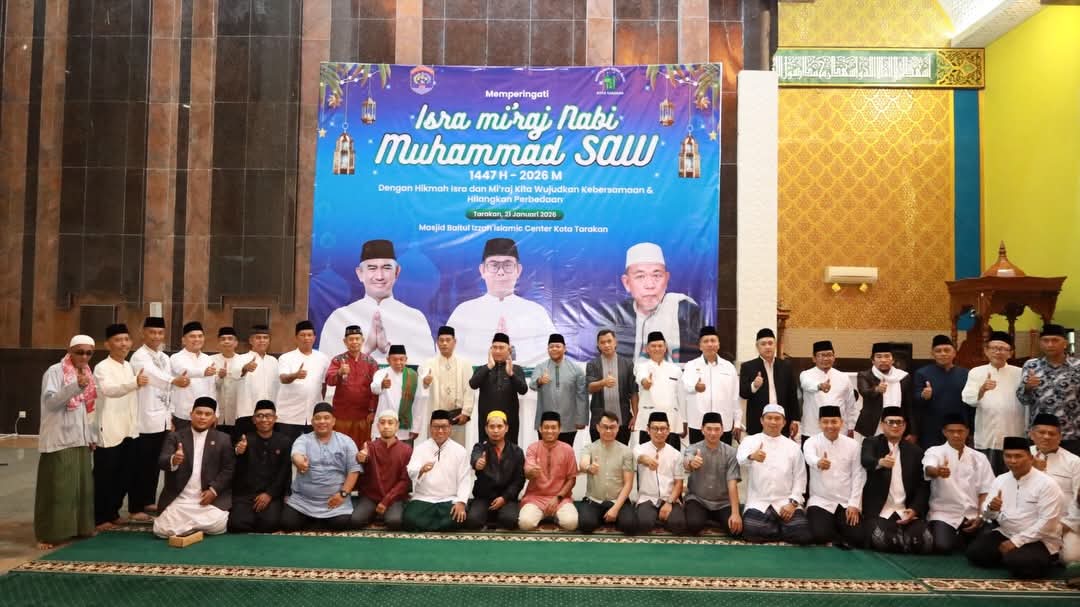 TARAKAN, KALTARA – Wali Kota Tarakan, dr. H. Khairul, M.Kes., didampingi Ibu Wali Kota Tarakan Siti Rujiah, S.Keb., Bdn., menghadiri peringatan Isra Mikraj Nabi Muhammad SAW 1447 Hijriah/2026 Masehi yang digelar di Islamic Center Baitul Izzah Tarakan, Rabu (21/1/2026).