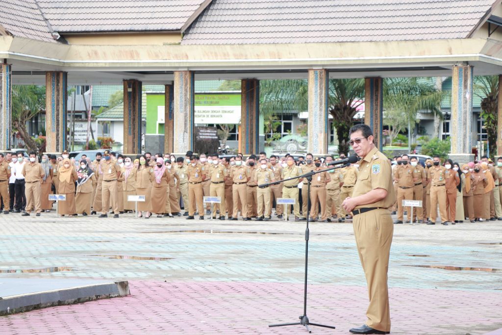 TANJUNG SELOR – Aparatur Sipil Negara (ASN) di lingkungan Pemerintah Provinsi Kalimantan Utara (Kaltara) kembali menggelar apel pagi di Lapangan Agatis, Senin (30/5/2022). Apel dipimpin oleh Wakil Gubernur (Wagub) Kaltara Dr. Yansen TP, M.Si. Dalam kesempatan tersebut Wagub menyampaikan amanat terkait kedisiplinan seluruh ASN.