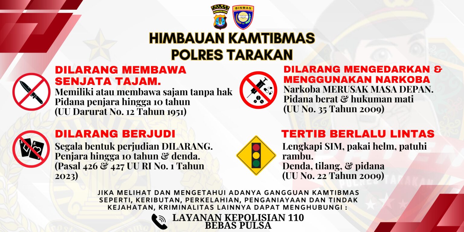 Melalui himbauan kamtibmas yang disertai dasar hukum ini, Polres Tarakan mengajak seluruh masyarakat untuk berperan aktif menjaga keamanan dan ketertiban lingkungan. Masyarakat juga dihimbau untuk segera melaporkan apabila mengetahui adanya potensi gangguan kamtibmas melalui Call Center Polri 110.(****)