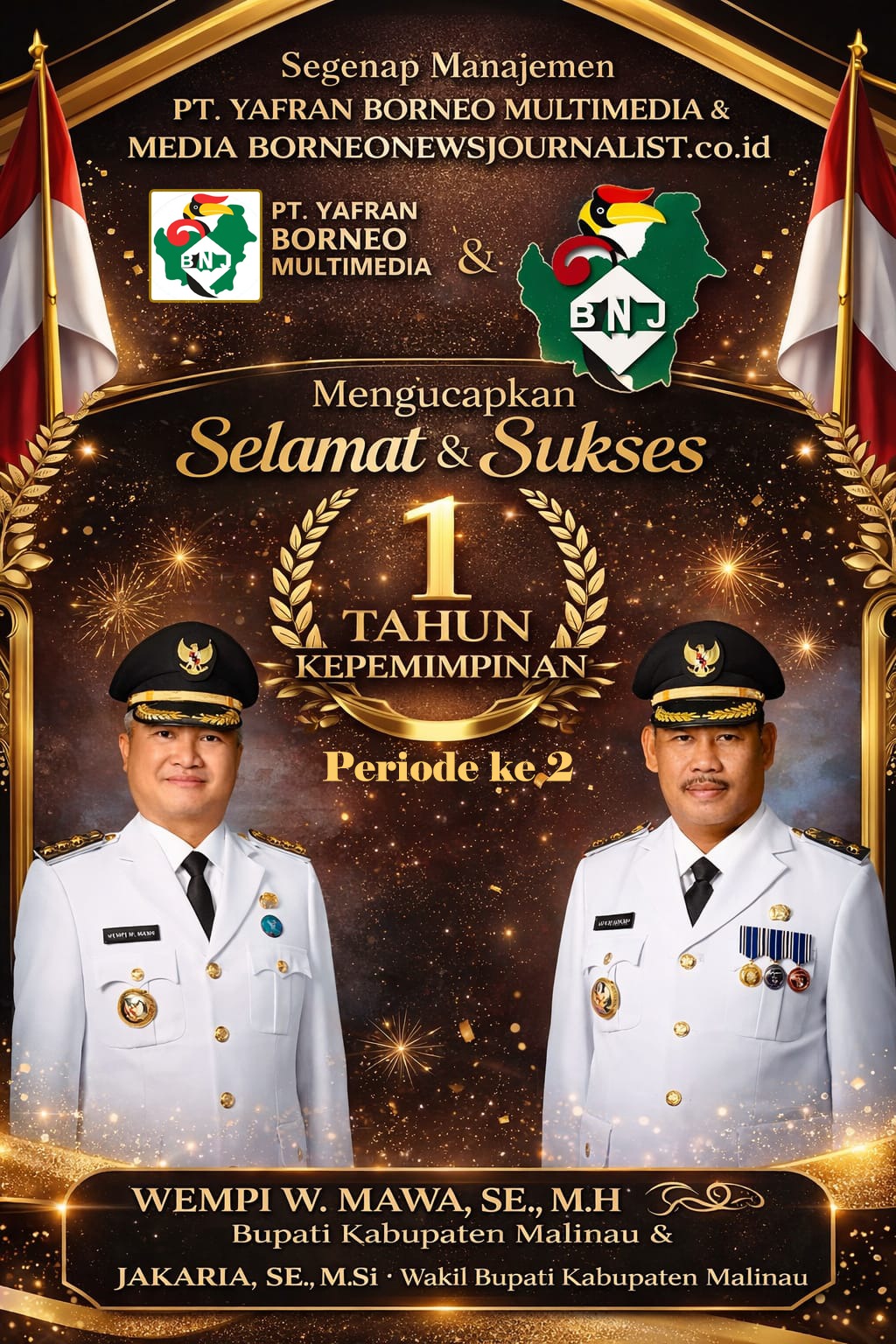 Borneonewsjournalist.co.id – Segenap manajemen PT. Yafran Borneo Multimedia bersama jajaran redaksi Media Borneonewsjournalist.co.id (BNJ) menyampaikan ucapan selamat dan sukses atas satu tahun kepemimpinan periode kedua Wempi W. Mawa sebagai Bupati Kabupaten Malinau dan Jakaria sebagai Wakil Bupati Kabupaten Malinau.