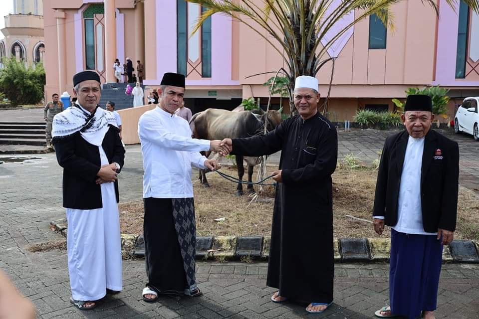 Setelah pelaksanaan sholat Idul Adha, Pj. Wali Kota melakukan penyerahan sapi kurban kepada pengurus masjid Baitul Izzah.