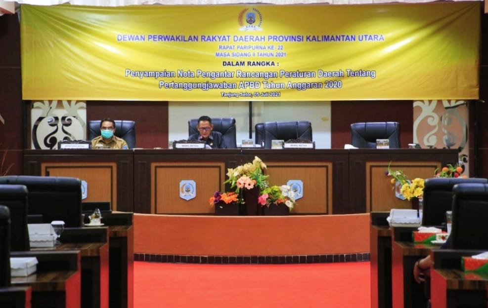 TANJUNG SELOR – Mewakil Gubernur Kaltara, Sekretaris Daerah (Sekda) Provinsi Kalimantan Utara (Kaltara), Suriansyah menyampaikan nota pengantar rancangan peraturan daerah tentang pertanggungjawaban Anggaran Pendapatan dan Belanja Daerah (APBD) tahun anggaran 2020 pada rapat Paripurna ke-22 di Kantor Sekretariat Dewan Perwakilan Rakyat Daerah (DPRD) Provinsi Kaltara.