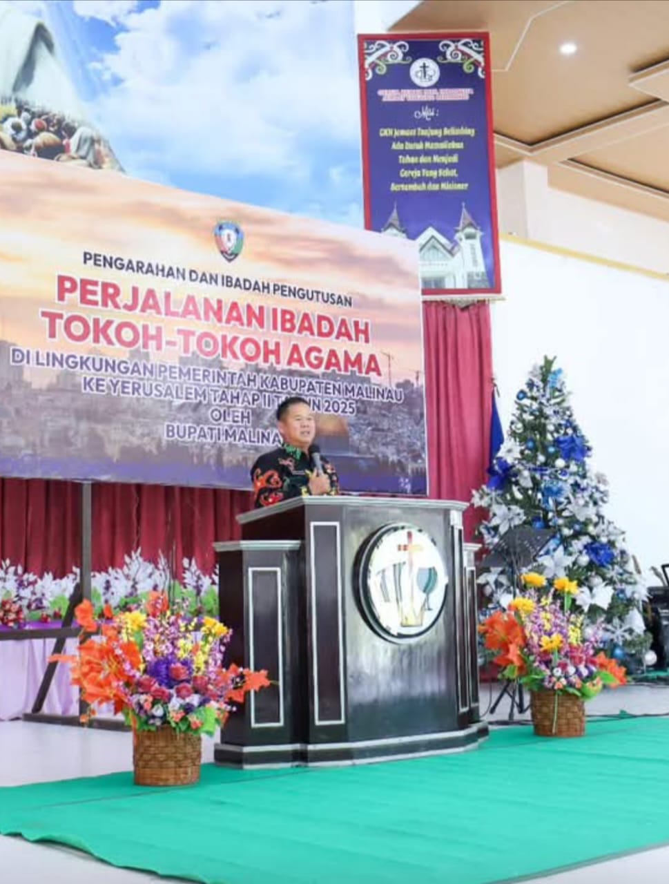 Malinau, KALTARA – Bupati Malinau Wempi W. Mawa, S.E., M.H., yang diwakili oleh Sekretaris Daerah Kabupaten Malinau, Dr. Ernes Silvanus, S.Pi., M.M., M.H., menghadiri Ibadah Pengutusan Perjalanan Ibadah Tokoh-tokoh Agama Tahap II Tahun 2025. Kegiatan tersebut berlangsung di GKII Tanjung Belimbing pada Kamis (27/11/2025) siang.