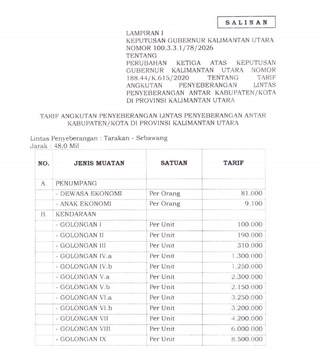 Penyesuaian tarif tersebut tertuang dalam Keputusan Gubernur Kalimantan Utara Nomor 100.3.3.1/78/2026, dengan kenaikan berkisar antara 10 hingga 20 persen.