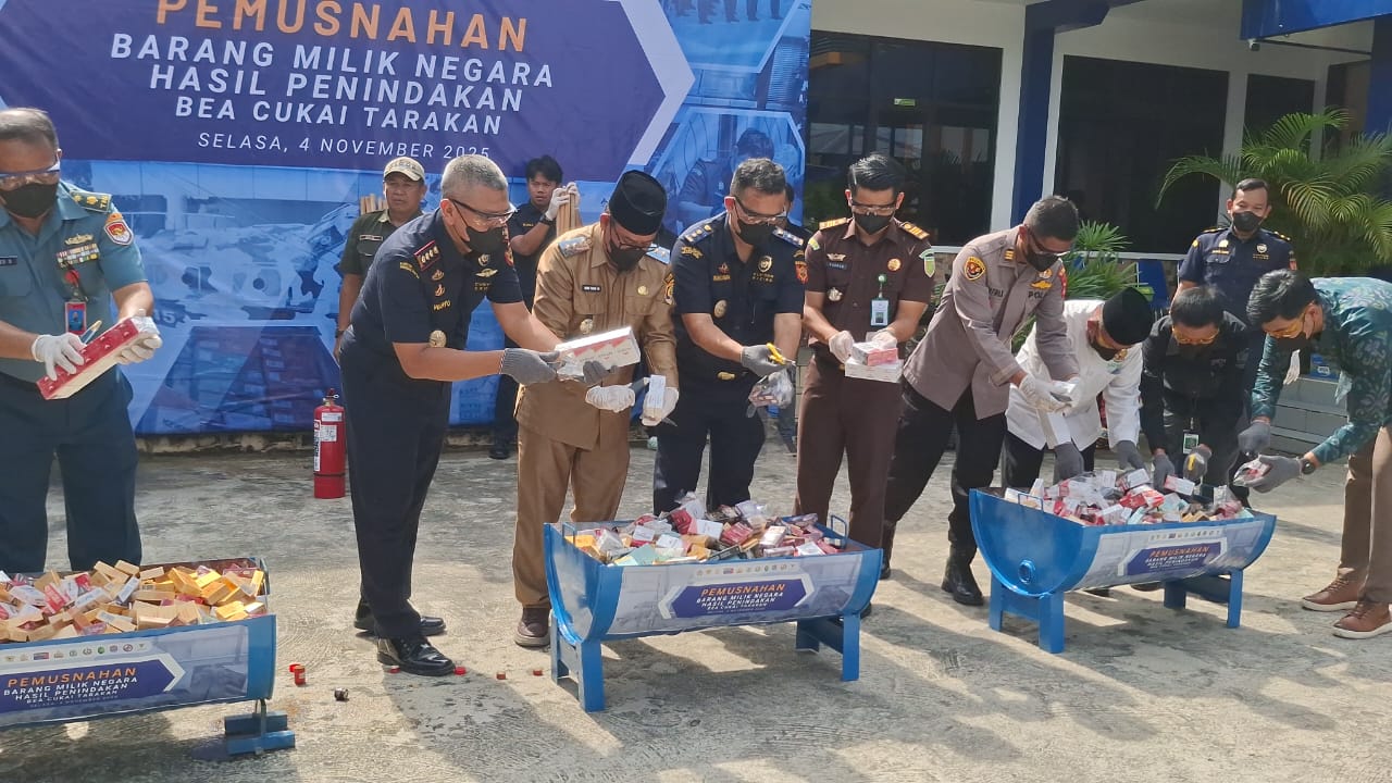 TARAKAN – Kantor Pengawasan dan Pelayanan Bea dan Cukai (KPPBC) Tipe Madya Pabean B Tarakan memusnahkan sejumlah barang ilegal hasil penindakan periode Mei hingga September 2025. Kegiatan tersebut berlangsung di halaman Kantor Bea Cukai Tarakan, Selasa (4/11/2025).