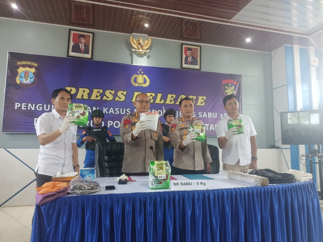 TARAKAN – Ditpolairud Polda Kaltara berhasil mengamankan 5 kg narkotika jenis sabu-sabu di perairan Tanjung Daun Kabupaten Tana Tidung (KTT) Kalimantan Utara pada Senin (25/12/2023) sekitar pukul 08.00 WITA. Hasil tangkapan tersebut dirilis pada Rabu (27/12/2023) pagi di kantor Polairud Polda Kaltara di Kota Tarakan. Dalam rilis tersebut 1 orang pelaku dihadirkan dalam press rilis.