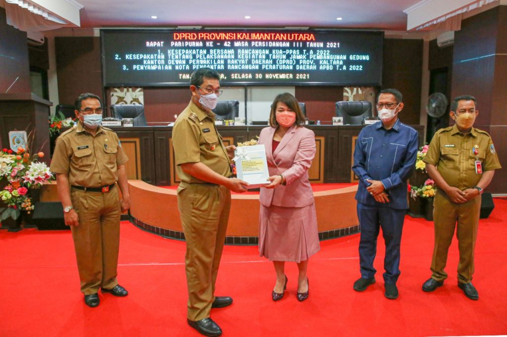 “Rapat paripurna ini membahas mengenai kesepakatan bersama rancangan Kebijakan Umum Anggaran Pendapatan dan Belanja Daerah (APBD, red) Prioritas dan Plafon Anggaran Sementara (KUA-PPAS, red), kesepakatan tentang pelaksanaan kegiatan tahun jamak pembangunan Gedung Kantor DPRD Kaltara, dan penyampaian Nota Pengantar Raperda (Rencana Peraturan Daerah, red) Anggaran Pendapatan dan Belanja Daerah (APBD, red) tahun anggaran 2022,” ujar Norhayati.